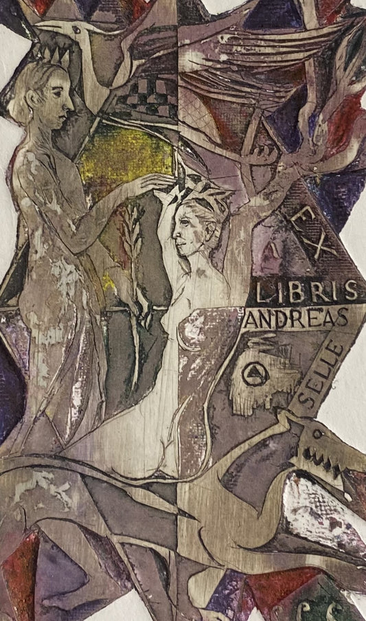 Ramunė Kmieliauskaitė | Ekslibris Andreas Selle, 2001 | Pop., autorinė technika (spalv. tekstolito estampas), 14x8,7 (24x18)