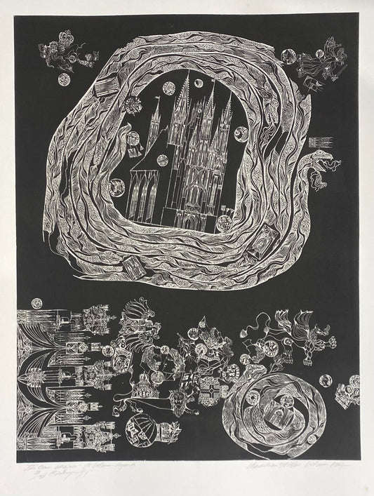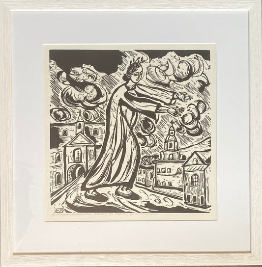 Viktoras Petravičius | Vilniaus simbolika, 1946 | Popierius linoraižinys, 30,5x30,5 (49,5x49)