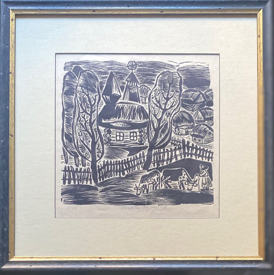 Albinas Načiulis | Kaimo peizažas, 1958 | Linoraižinys, 9,5x16,5 (26x33)