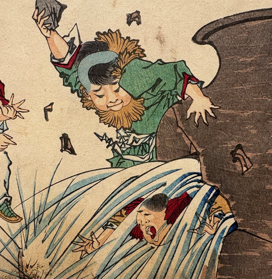 Tsukioka Yoshitoshi (月岡芳年) (1839-1892) | Onkō sudaužo indą ir išgelbsti vaiką | 1882 | Medžio graviūra, 19x23 (29,5x35)