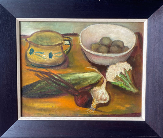 Pranas Domšaitis | Natiurmortas su daržovėmis | Aliejus, kartonas, 37x47 (50x60)