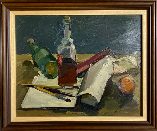 Juzefa Katiliūtė | Natiurmortas su buteliais ir teptukais | Aliejus, kartonas, 34x42 (43x51)
