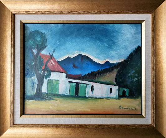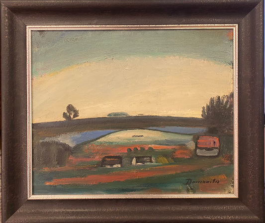 Pranas Domšaitis | Karoo peizažas su namais prieblandoje | Aliejus, kartonas, 35x51 (52x68)