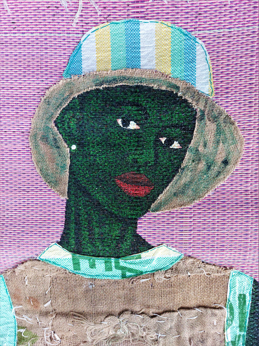 Emmanuel Kwaku Yaro (g. 1995, Gana) | True Self, 2022 | Akrilas, austa nailoninė medžiaga ir maišinis audinys ant plastiko, 182x136