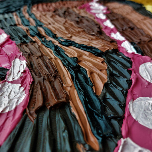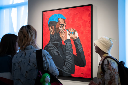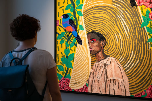 Gyan's work is inspired by a range of sources, including his immediate environment, urban culture, and fashion. He strives to bring all of these influences into his work, creating pieces that are both deeply personal and reflective of the world around him. He often centers the black feminine form in his paintings, using brilliant colors to create a sense of space and compositional balance that draws the eye in. In doing so, he seeks to celebrate black beauty and identity, challenging prevailing societal norms that have long sought to marginalize and denigrate people of color.