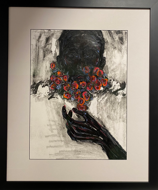 At the heart of Tegene's art is a profound exploration of human connections—both the inherent boundaries within individuals and the constructed barriers people impose on themselves. Drawing inspiration from her own emotional experiences and relationships, Tegene transforms these insights into deeply personal responses to the world. Her portraiture captures specific emotional moments, drawing on details from intimate conversations, public exchanges, song lyrics, or fictional narratives. The result is a collection of prints that speak to the intricate tapestry of human relations, blending "real" details with imaginative flourishes.