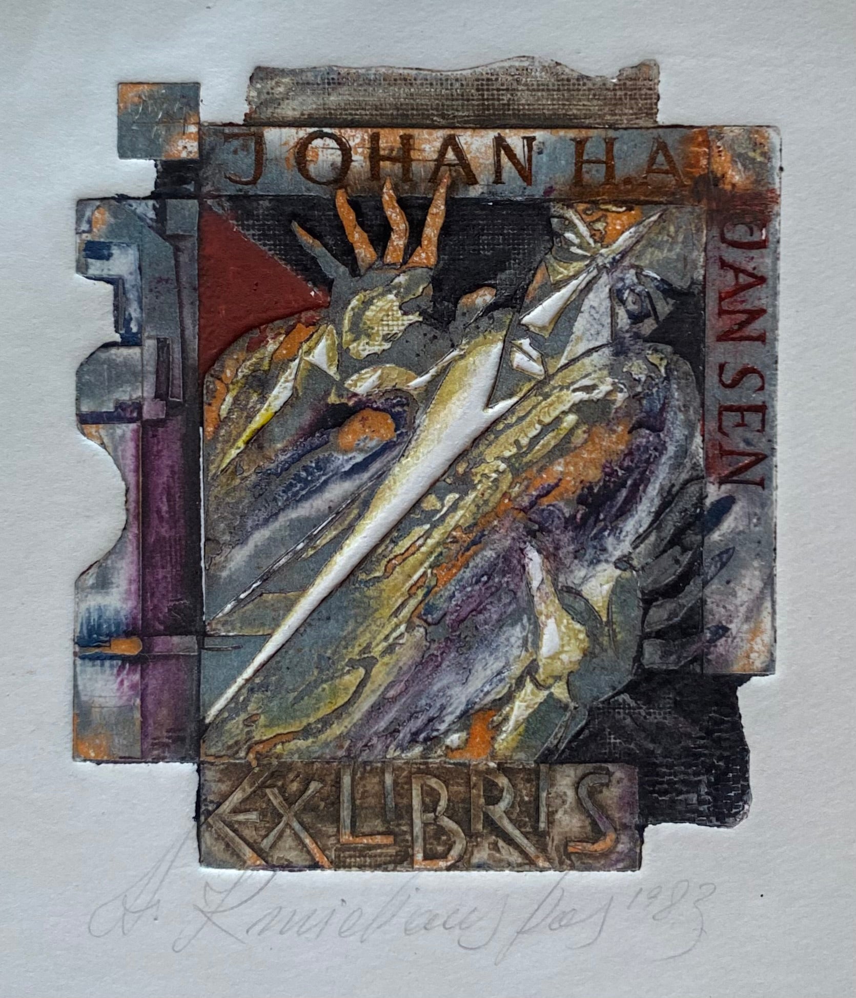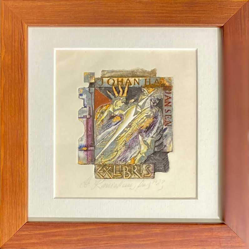Antanas Kmieliauskas | Ekslibris Johan H.A. Jansen, 1983 | Pop., autorinė technika (spalv. tekstolito estampas), 7,9x6,8 (17,5x17,5)