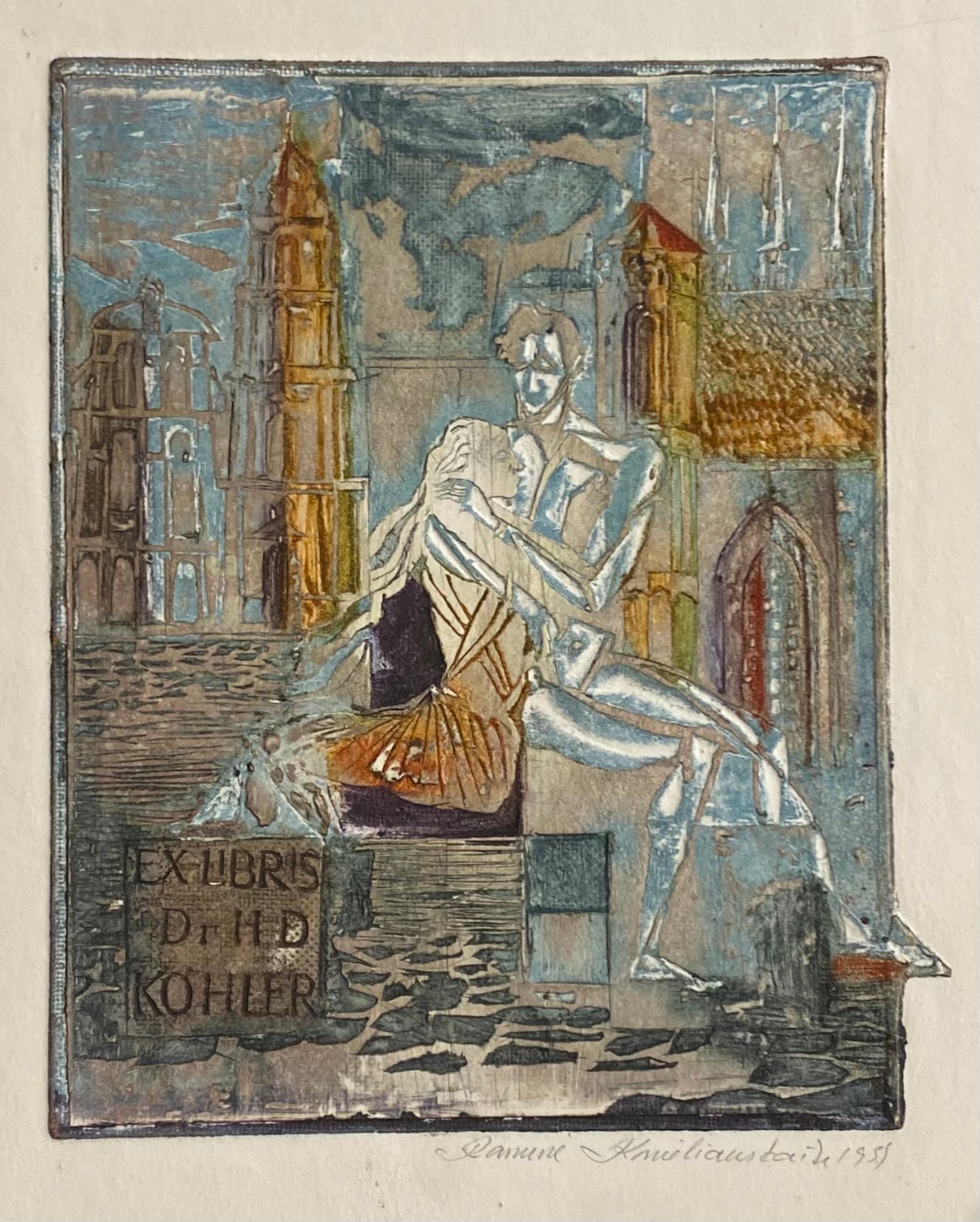Ramunė Kmieliauskaitė | Ekslibris Hans Dieter Köhler, 1993 | Pop., autorinė technika (spalv. tekstolito estampas), 11,5x9,9 (20x15)