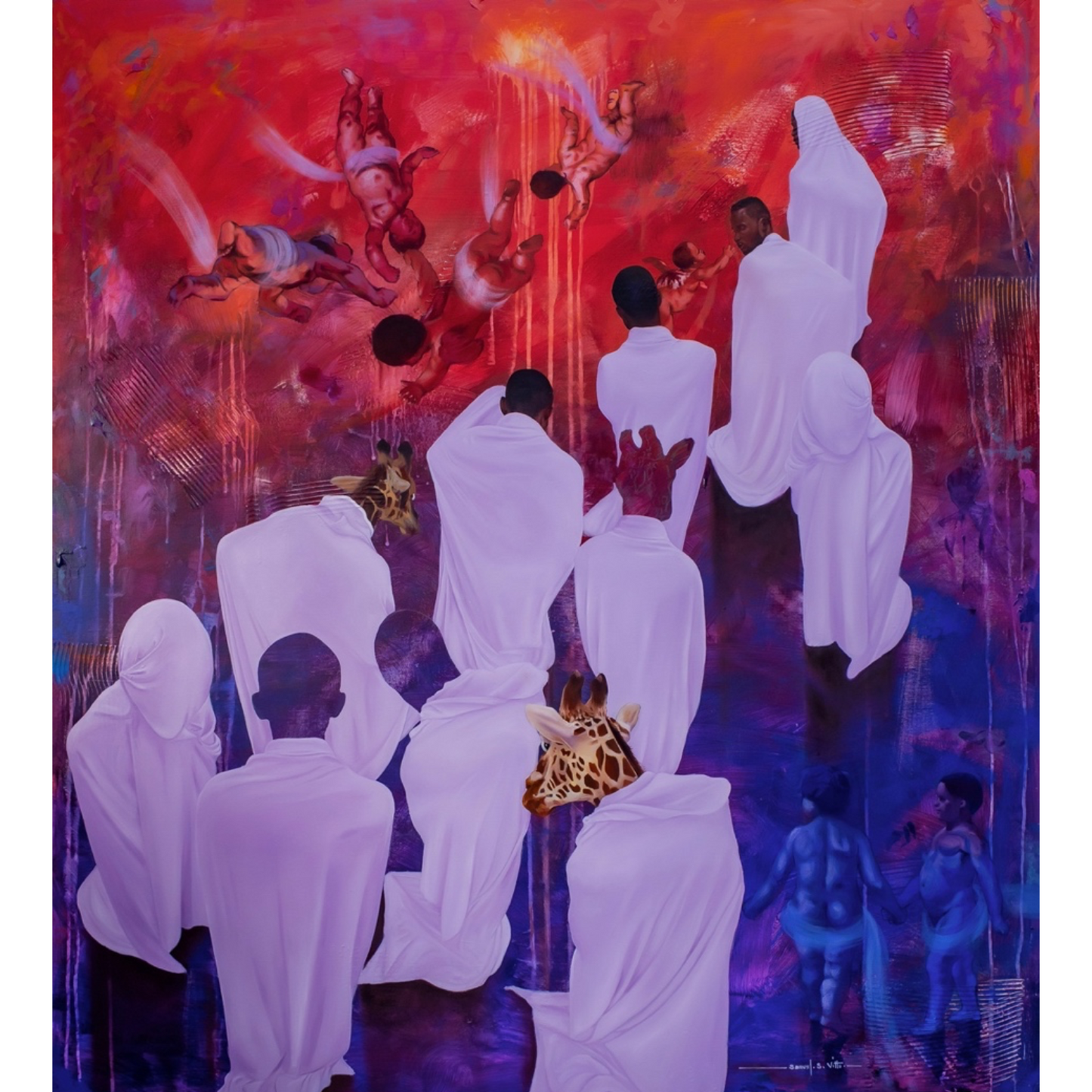 Vienas ryškiausių Samuel kūrybos bruožų – portretinė antropomorfinė tapyba, kurioje susilieja žmogaus ir gyvūno siluetai. Ši forma leidžia kalbėti apie vieną iš aktualiausių šiandienos reiškinių – priverstinę migraciją dėl klimato kaitos.