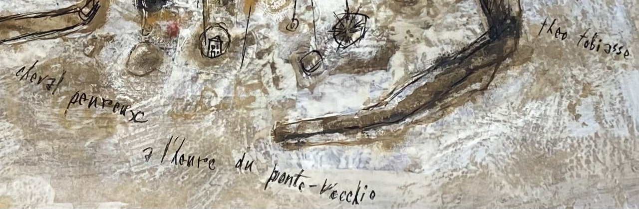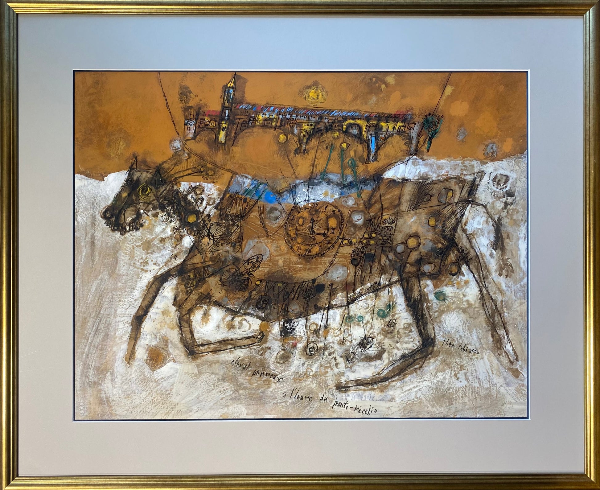 Theo Tobiasse | Cheval Peureux a l'heure de Ponte Vecchio / Baugus arklys Ponte Vecchio valandą, 1964 | Guašas, tušas, popierius, 48x64 (69x84)