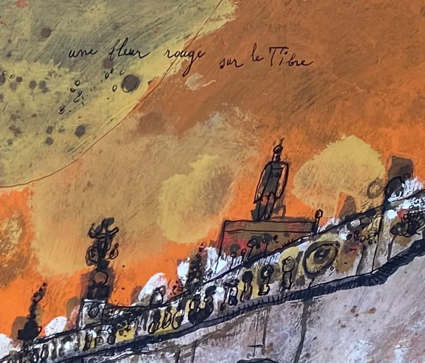Theo Tobiasse | Un fleur rouge sur le Tibre / Raudona gėlė virš Tibro, 1968 | Guašas, tušas, popierius, 50x66 (72,5x88,5)