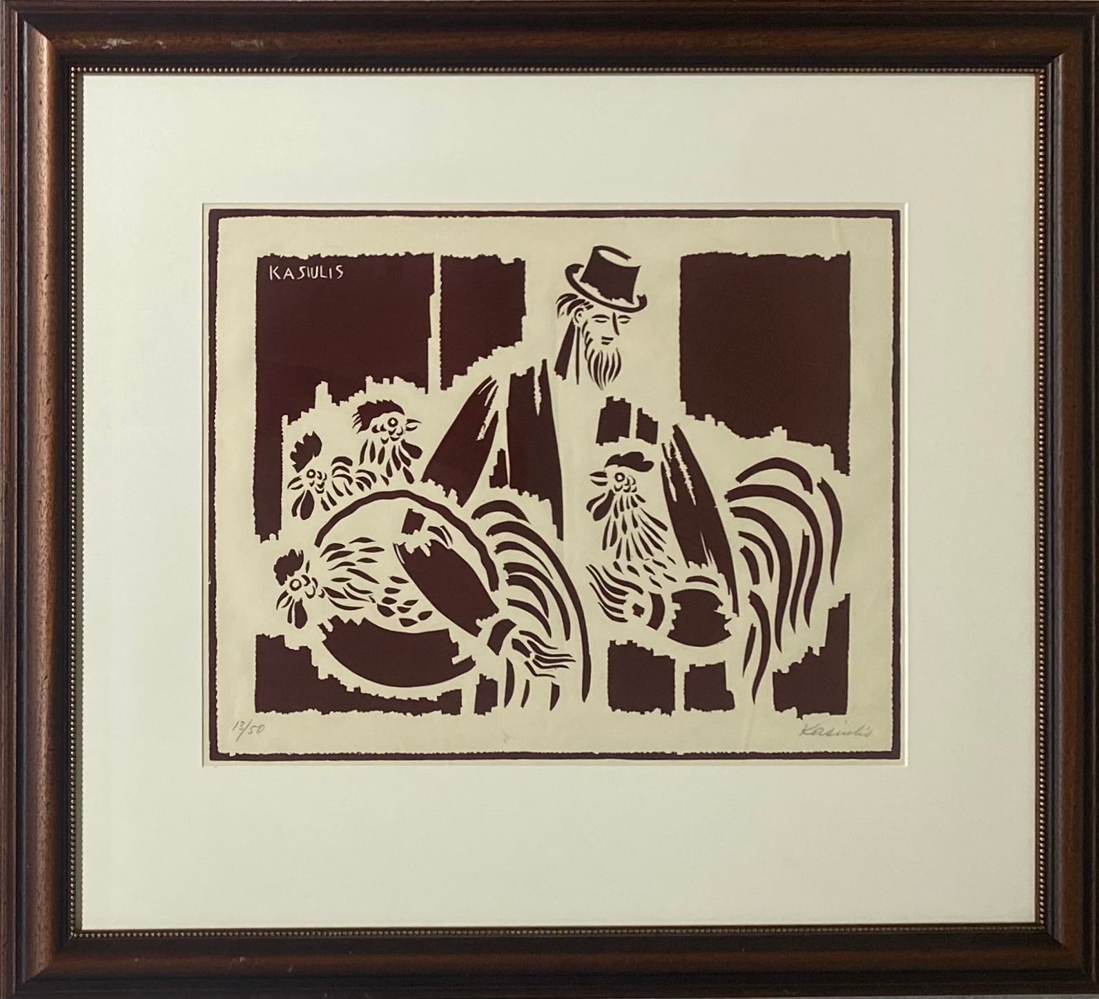 Vytautas Kasiulis | Kompozicija su gaidžiais, 1969 | Linoraižinys, popierius, 40x51 (73x87)